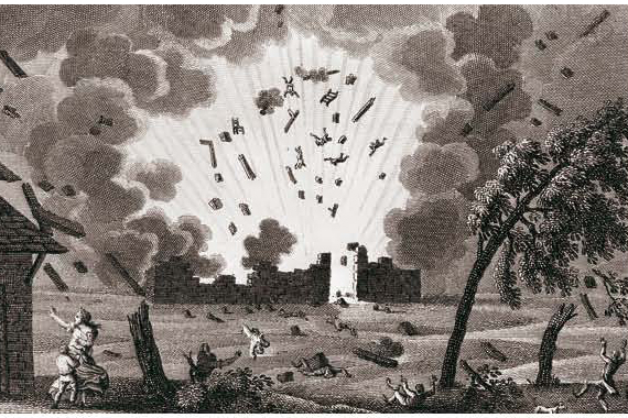 Selon les sources, ce sont 30,2 tonnes ou 150 tonnes de poudre noire qui explosent. Les arbres sont coupés, les bâtiments et les immeubles avoisinant sont soufflés.
