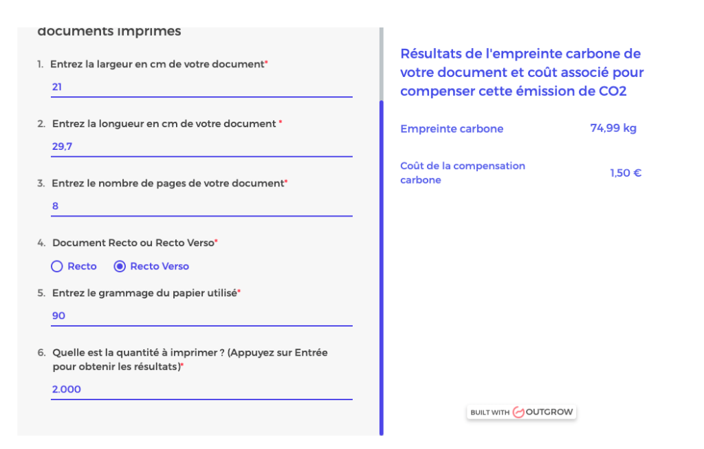 Et c’est une calculatrice d’un genre un peu particulier qu’il a mise au point. D’un usage très simple et en accès libre en ligne, elle permet à quiconque le souhaite de calculer l’empreinte carbone des document qu’il va faire imprimer. Il suffit d’entrer les caractéristiques de votre document (format, R°/V° ou pas, nombre de pages; quantité…) et la calculatrice vous donne non seulement le poids de votre empreinte carbone mais également le coût de la compensation de celle-ci.