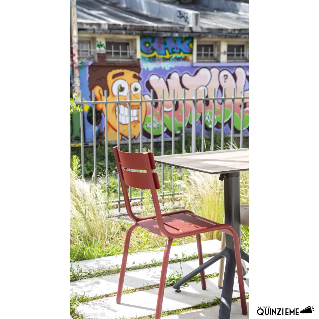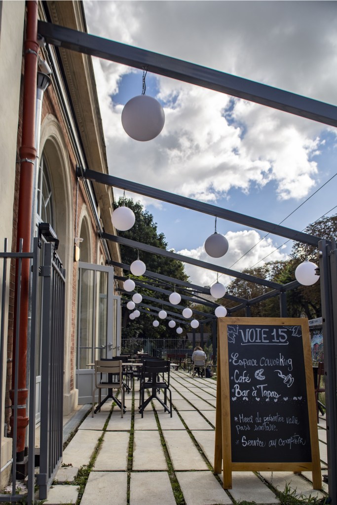 Alexandre tique un peu quand j’évoque le mot de guinguette en parlant de Voie 15. Si j’emploie le terme, c’est parce que l’espace me fait furieusement penser à ces havres de paix, un peu originaux, que l’on trouvait en bord de Marne. On pouvait y manger sur le pouce ou un peu plus copieusement ou seulement y boire un verre. C’est le climat que m’inspire Voie 15 qui m’évoque ce mot. Alexandre Nguyen préfère le terme d’espace de restauration puis il devient intarissable (presque) sur l’approche équitable du projet. La plupart des aliments sont bio et les déchets organiques sont recyclés. Ce restaurant est ouvert à tous. Nul besoin d’être un coworker pour venir s’y restaurer ou y boire un café. Tous les promeneurs (y compris ceux accompagnés d’un chien) sont les bienvenus.