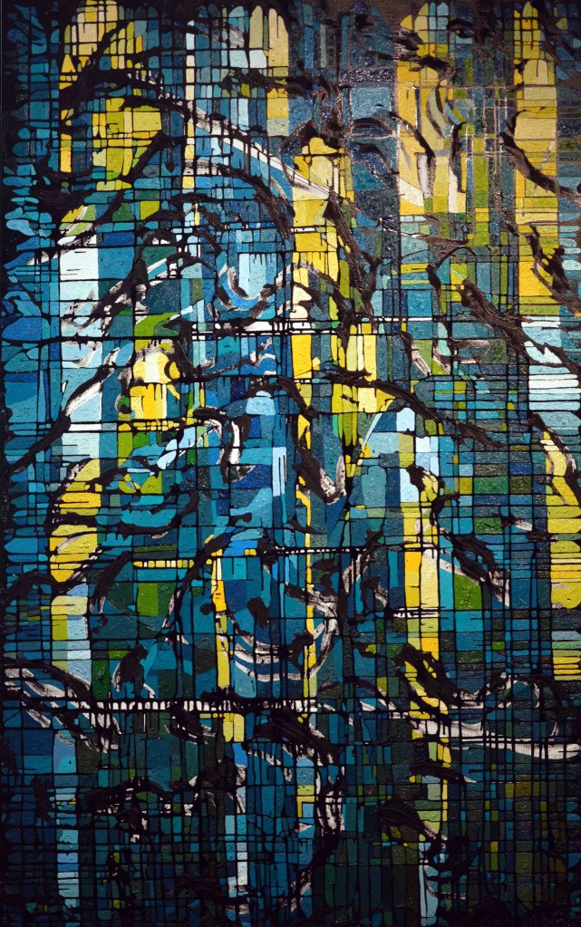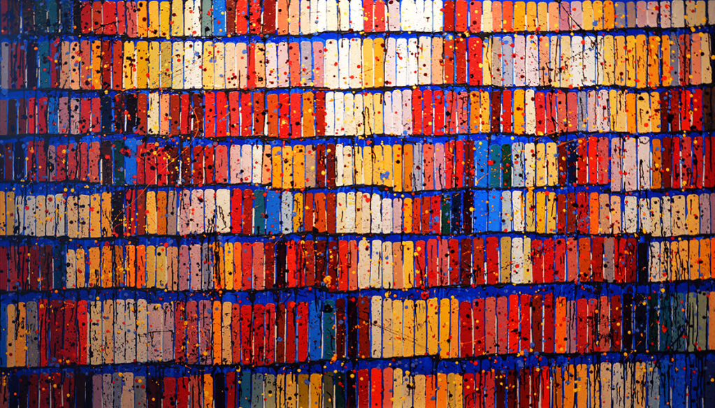 Dès le premier regard, on est happé par l’intensité de son œuvre. Un chaos organisé de couleurs primaires : des rouges flamboyants, des bleus profonds, des jaunes éclatants, des verts émeraude… Une explosion chromatique qui évoque un vitrail médiéval éclaté, une mosaïque d’un temple maya déterré, ou peut-être la projection d’un rêve d’enfant.