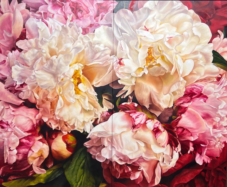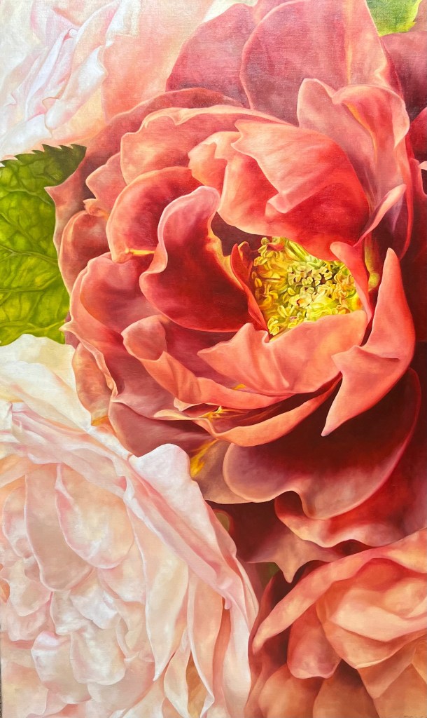 Chaque pétale de pivoine semble palpiter. La lumière ne frappe pas la toile ; elle émane des profondeurs de la matière, circulant entre les replis de nacre et les ombres rosacées.